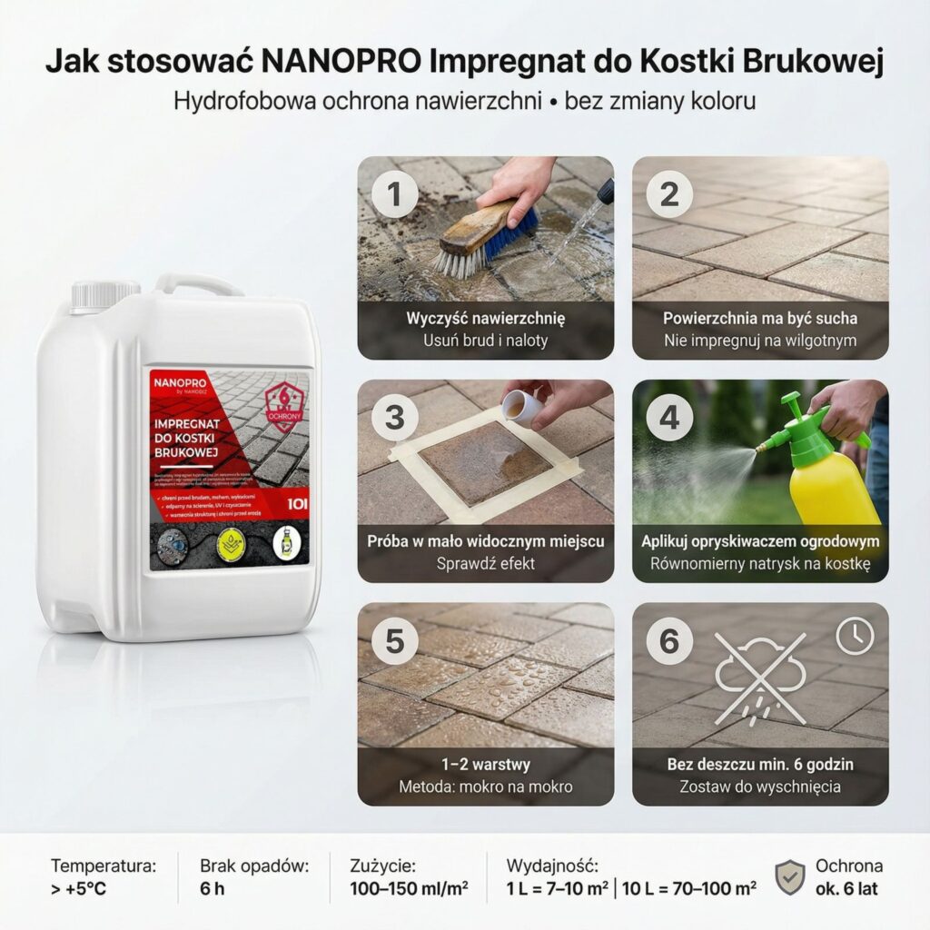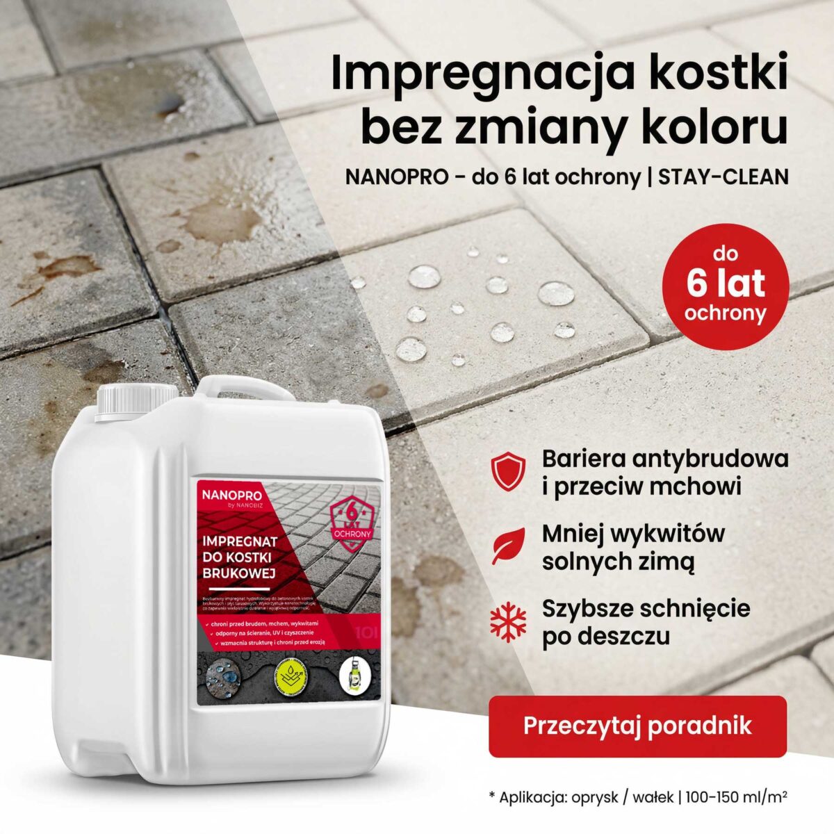 Jeżeli chcesz zachować naturalny wygląd kostki, a jednocześnie ograniczyć brudzenie, zmniejszyć ryzyko zielonego nalotu i ułatwić zimowe utrzymanie, to NANOPRO Impregnat do kostki brukowej jest rozwiązaniem praktycznym — pod warunkiem, że zrobisz to jak należy: czysto, sucho, w odpowiednich warunkach i (przy dwóch warstwach) „mokro na mokro”.